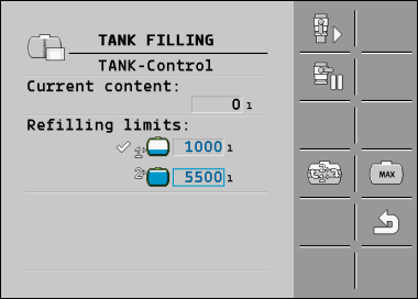 If a TANK-Control with fill stop has been installed and configured on the field sprayer, you can use it. It will stop tank filling automatically when a specified fill level is reached.