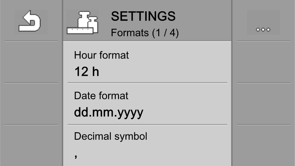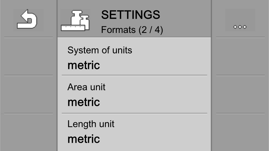 On the "Formats" screen, you can define the units used by the terminal and the connected devices.