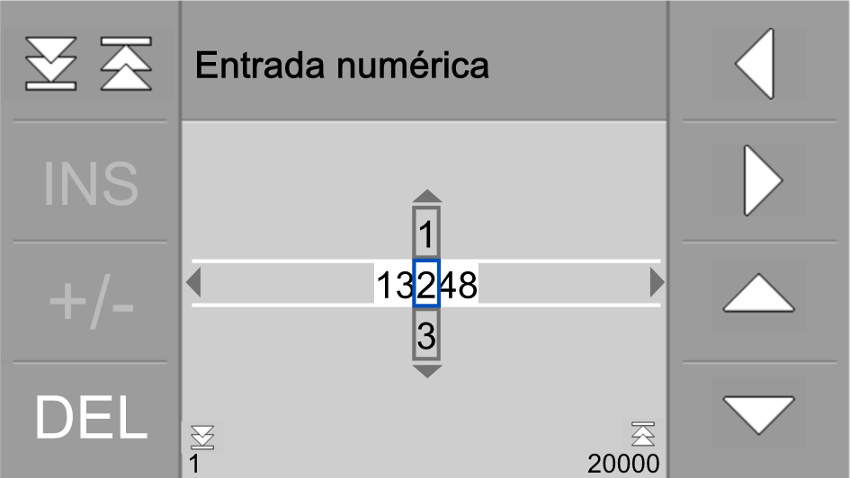 Para introducir números en la aplicación aparece siempre la misma pantalla. Utilice los controles individuales para modificar los números según sea necesario. En la parte inferior de la pantalla se puede ver el valor mínimo y máximo.