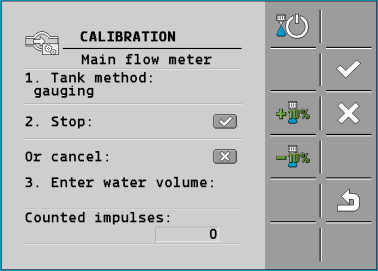 - During application, the number of impulses will be counted on the “CALIBRATION – Main flow meter” screen.