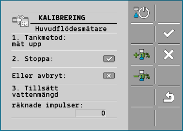 - Under spridningen räknas antalet impulser på sidan ”KALIBRERING” - huvudflödesmätare.
