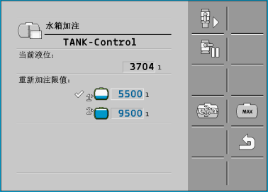 前提是田间喷雾机已安装和配置了带有自动停止加注功能的 TANK-Control。它将在达到指定的液位后自动停止水箱加注。