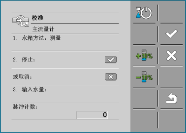 - 在喷施过程中,将在“校准 - 主流量计”屏幕中计算脉冲数。