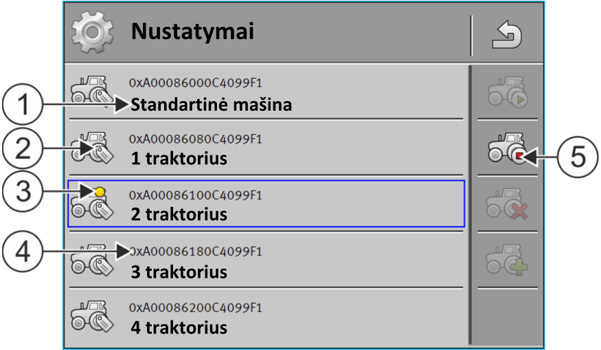- terminalą galite naudoti keliuose traktoriuose. Kaskart pakeisdami traktorių, galite aktyvinti tinkamą traktoriaus profilį;