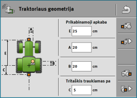 | Atstumas nuo transporto priemonės vidurio iki GPS imtuvo kairėje ir dešinėje ašyje. Jeigu imtuvas sumontuotas kairėje pusėje, įveskite neigiamą vertę. „TRACK-Leader AUTO®“ naudotojams: GPS imtuvo padėtį taip pat reikia įvesti ir sukalibruoti vairavimo darbo kompiuteryje. Dėl to laukeliai A ir B yra papilkinti ir jų redaguoti negalima. |