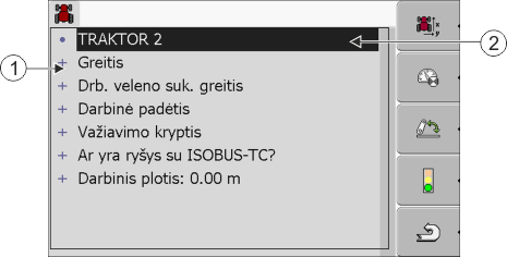Šiuo parametru nustatote, ar taikomoji programa „Tractor-ECU“ turi keistis duomenimis su taikomąja programa „ISOBUS-TC“. Ši taikomoji programa perduoda: Skaitiklių vertes, darbinę padėtį, GPS imtuvo padėtį.