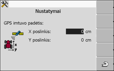 Įvedant šį atstumą svarbu, ar GPS imtuvas įrengtas į kairę, ar į dešinę nuo traktoriaus išilginės ašies ir ar jis yra už pakabos taško.